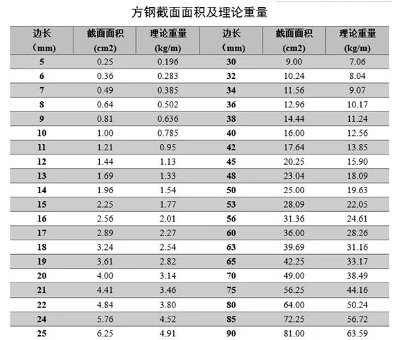 熱軋方鋼理論重量=邊長(mm)×邊長(mm)×0.00785=kg/m,具體截面面積及理論重量見下表: